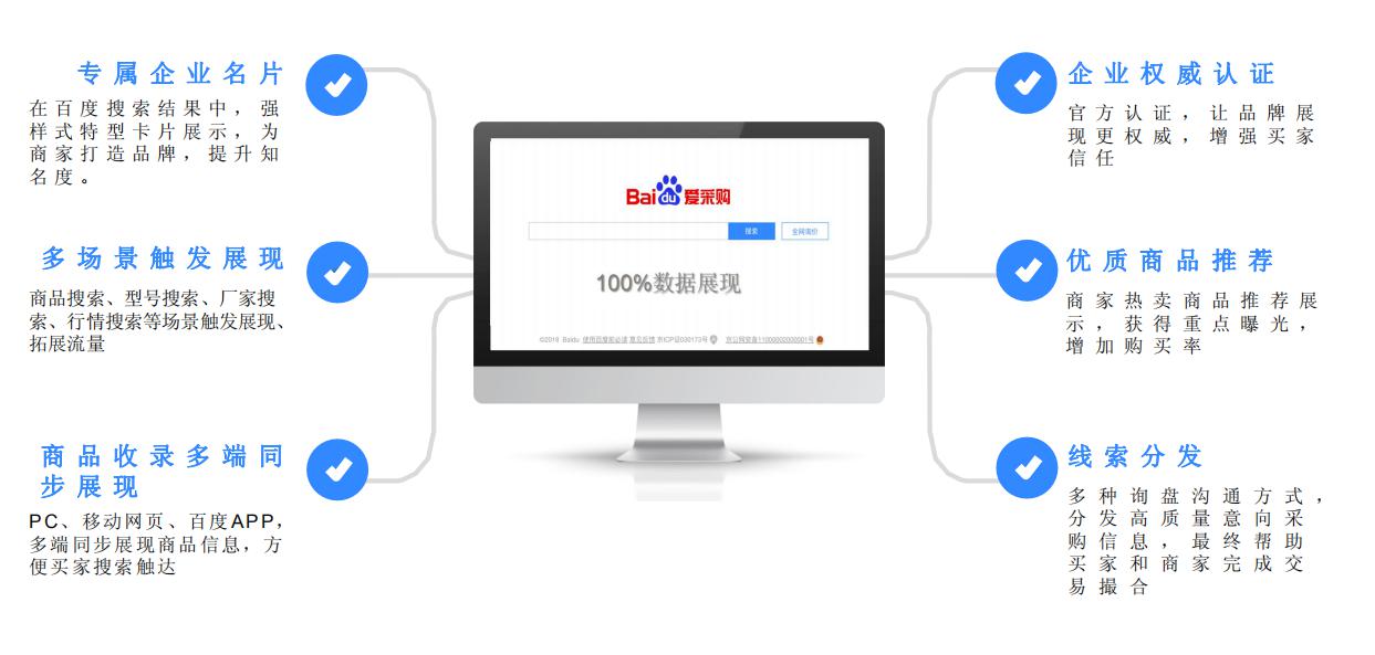 通过网加思维入驻爱采购的高级会员可以享受数据推送到百度爱采购平台的机会,并可在百度搜索结果页拥有专属企业名片,企业信息和优质商品同步展现;并且获得百度信誉认证,强化品牌认知,凸显企业实力, 增强客户信任度。实现PC 端、移动端、百度APP 多端展现,在为客户做品牌宣传的同时,强化产品曝光,提高成单机会。