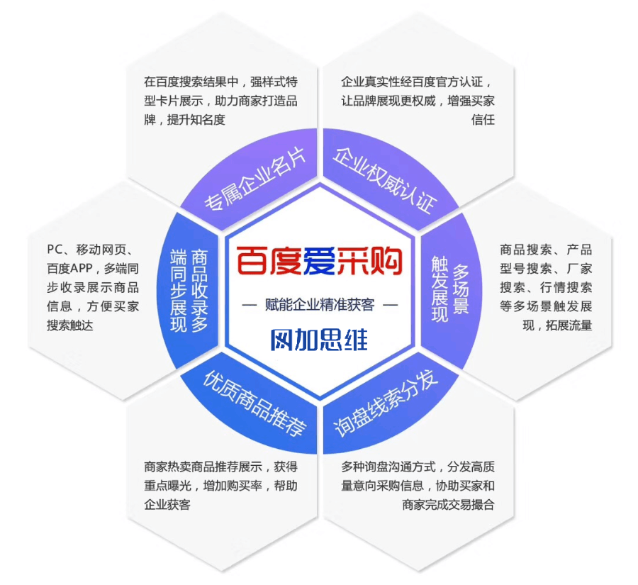 通过网加思维入驻爱采购的高级会员可以享受数据推送到百度爱采购平台的机会,并可在百度搜索结果页拥有专属企业名片,企业信息和优质商品同步展现;并且获得百度信誉认证,强化品牌认知,凸显企业实力,